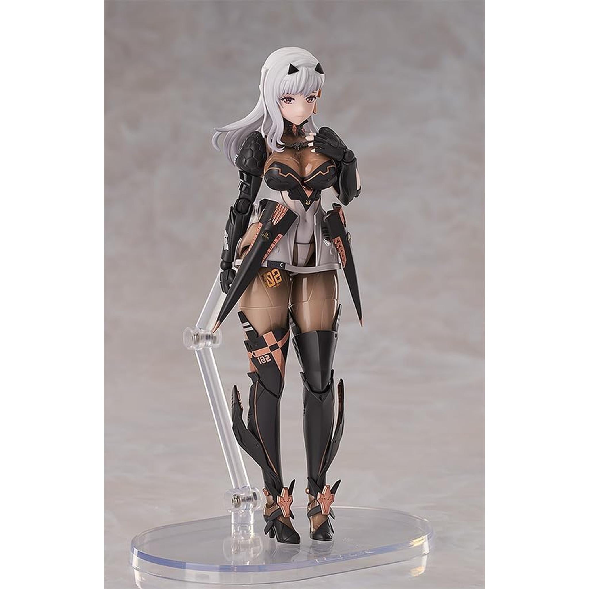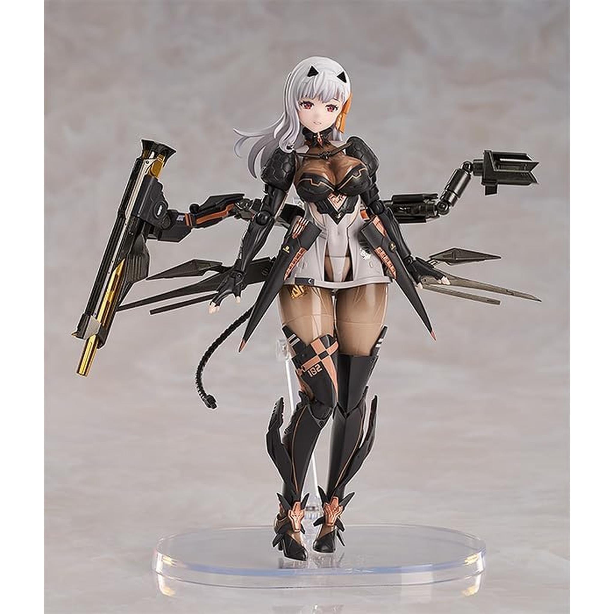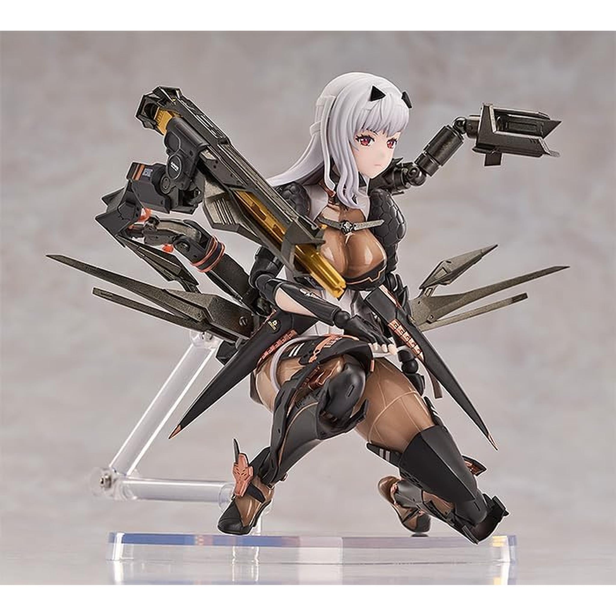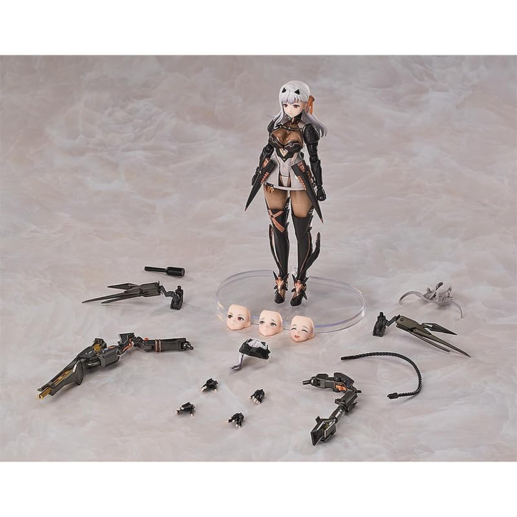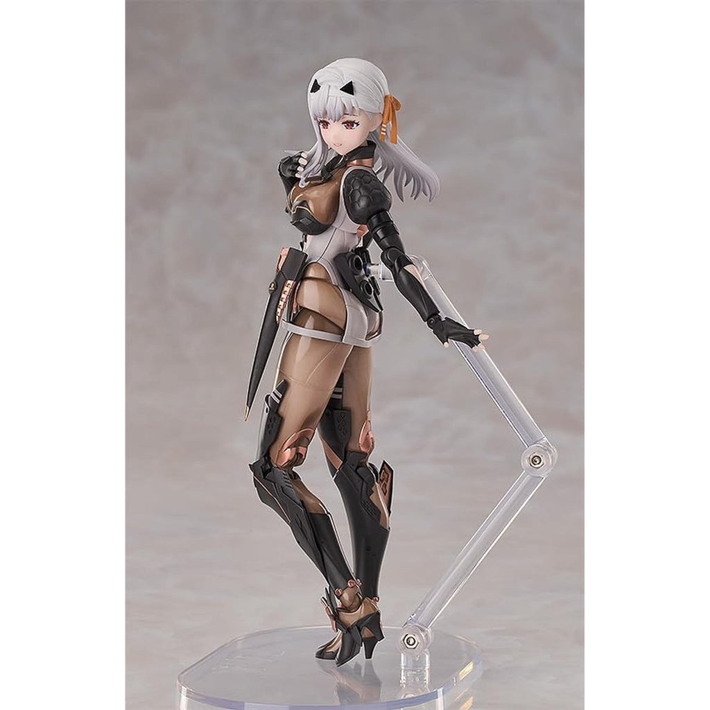 表情パーツは「笑顔」、「喜び顔」、「真剣顔」、そして「悲しい顔」を含みます。オプションパーツには「背面武装アーム」、「戦闘用ゴーグル」、そして「攻撃ポーズ用交換スカート」があります。背面の武装アームは自在に回転可能です。 腰パーツは柔らかいPVC素材を採用して、ゲーム中の攻撃ポーズもとれるように可動域を確保しました。かわいくてかっこいい「モダニア」を、是非お家にお迎えください。